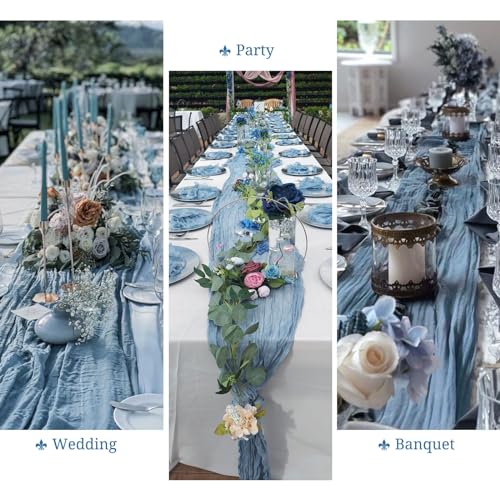 - 【Suitable Size】You will receive 12 pieces 10ft length Dusty Blue cheesecloth table runner with wrinkled texture, enough quantity is suitable for wedding banquets and various parties, Each tablecloth measures approximately 21 x 120 inches/55 x 300 cm and appropriate for round or rectangle tables that can seat 8-10 people. The elegant table runner can meet your needs for table decoration adds a romantic atmosphere to your wedding or special events.