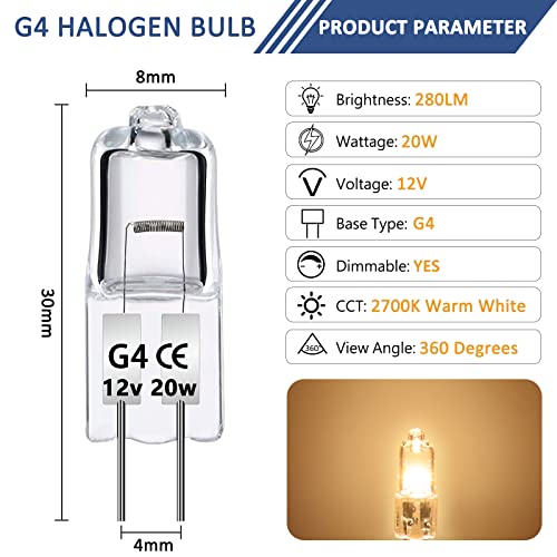 - 【Long Lifespan】Size: 30*8mm. The Halogen bulb G4 12V 20W delivers up to 280LM of warm white light 2700K to fill your home with warmth and brightness. The average lamp life is up to 2000 hours. No frequent replacement required.