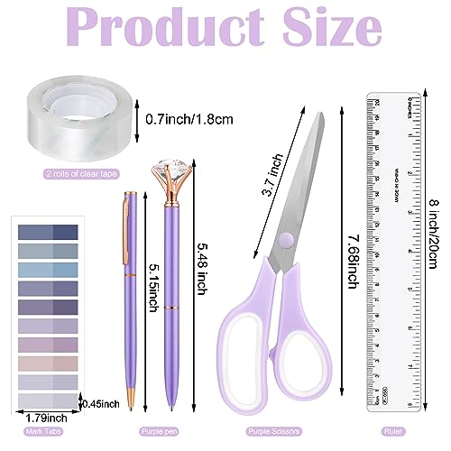 - 【Product Size】Purple stapler approx 4.74 x 1.24 x 1.94 inches, tape dispenser approx 4 x 2.05 x 1.65 inches, staple remover approx 2.19 x1.55 inches, staple type 24/6, purple pen holder approx 3.78 x 3.15 inches, tape the width is about 0.68 inches, scissors is about 7.48 inches, diamond ballpoint pen is 5.47 inches, the clip has a storage box, the size of a single sticky tabs is 1.77 x 0.45 inches, and the ruler is 8 inches (Please confirm the size before buying)