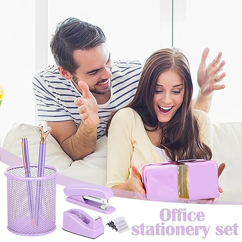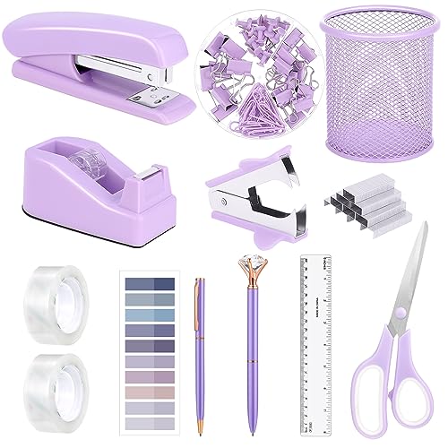 - 【Package Includes】You will receive a complete purple office supplies set, including 1 purple stapler, 1 purple tape holder, 2 clear tapes, 1 staple remover, 1 pen holder, 1000 24/6 staples, 1 scissors, 1 ruler, 1 tabs, 1 diamond ballpoint pen, 1 purple pen, 1 clip set (includes 30 paper clips, 7 large binder clips, 15 small binder clips, 20 thumbtacks)