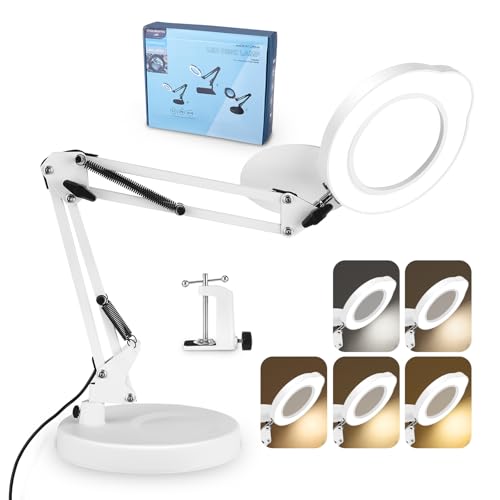 - 【5 Color Modes & Stepless Dimmable】Magnifier with light and stand offers 5 color modes and 10 dimmable brightness to suit your needs. High-Quality ring LED lights provide you with even, flicker-free light, giving you a clearer view and reducing eye fatigue caused by prolonged observation. The table magnifying glass with light has a memory function can keep the mode and brightness last used.