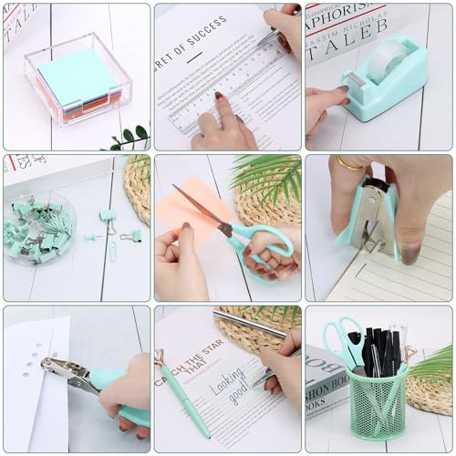 - VARIOUS OFFICE DESK ACCESSORIES: The set includes a total of 17 office supplies, with 3 office desk organizers and 14 other office tools: 4 ballpoint pens, 1 hole punch, 1 stapler, 1 box of 24/6 staples, 1 staple remover, 1 pair of scissors, 1 6.7-inch ruler, 1 box of clips, 1 roll of clear tape, 1 tape dispenser, and 1 sticky notes holder. This set is designed to meet all your daily office needs