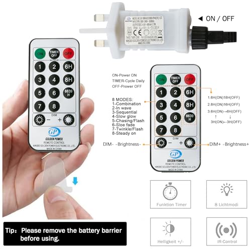 - 8 Mode Lights & 3 Timer Function: Powered by an electrical outlet, this copper wire light string features 8 lighting modes and can be easily controlled via the remote's power button. With a built-in 6, 8, 6639(6 hrs on, 6hrs off, 3hrs on, 9hrs off) hrs auto-off timer, it ensures worry-free use.