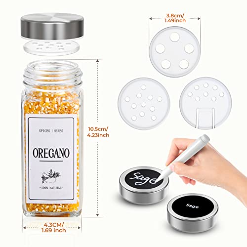 - 🧂【120ML/4OZ Kitchen Spice Jars】Each Round jar measures approximately 10.5 cm / "4.23 "x 4.3 cm / "1.69"with 3.8 cm / "1.49 "opening. It will fit any spice rack, closet, organizer, drawer or kitchen storage & organization. The clear glass gives you a clear view of spices. Reusable round labels help you diy on the sides or in the jars. The collapsible funnel makes it easier to add new spices to the jars and store.