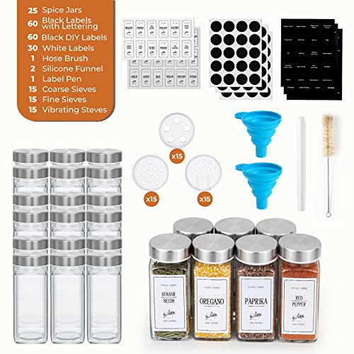 - 🧂【Extensive Spice Storage Kit】Full set includes 25 Round stainless steel glass spice bottles with metal lids, 45 spice sieves, 2 collapsible funnels, 1 hose brush, 1 labelling pen, 240 waterproof spice bottle labels (144 black pre-printed labels and 36 black blank DIY labels and 60 pre-printed white labels),(Please note. In order for customers to receive flat stickers, we place the white stickers and associated accessories at the bottom of the pack).