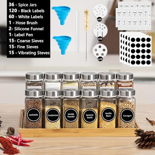 - 36 Pack Spice Jars with Lids:Complete set included: 36pcs square glass spice jars, 45 shaker lids, 1 label pen, 1 hose brush, 180 waterproof spice jar labels(120 black labels and 30 white labels-30 White blank DIY label), 2 collapsible funnels;(Please Note:In order to customers can receive flat stickers, we put the white stickers and related accessories on the bottom of the package )