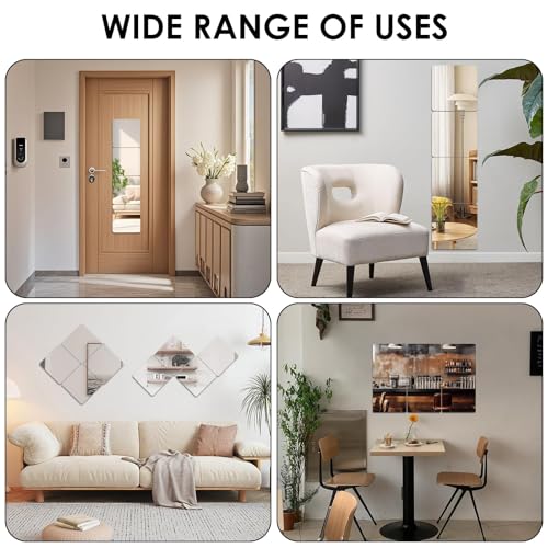 - Multipurpose & Versatile Use: These stick on mirror tiles ideal for use as cosmetic mirrors, gym mirrors, closet mirrors, and hallway decorations. Perfect for vanity tables, dressing rooms, home offices, or dance studios. Stick on mirrors for walls installs easily and removes cleanly without leaving marks or residue.