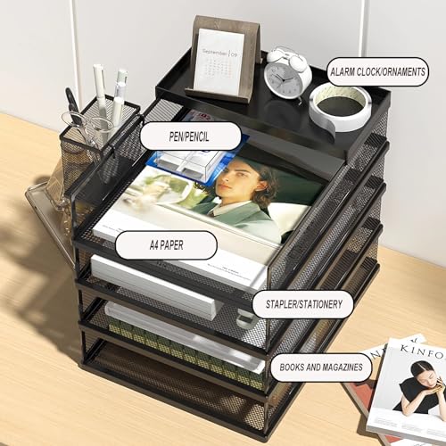 - 【EXTRA DISPLAY SHELF AND PENCIL HOLDER】:Our paper tray organizer has a small tray on th top,the Upper display shelf is very suitable for small flower pots, decorations, staplers, calculators and other desk accessories.Comes with a hanging pen holder to organize your desktop more effectively.