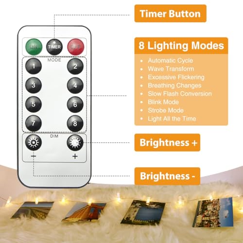 - 【8 Lighting Modes and Remote Control】The photo clip string lights have 8 mode settings: combination, wave, sequence, slogs, hunting/flash, slow fade, flicker/flash and steady light. Easily adjust the brightness (with dimming function) and adjust the timer by the remote control.