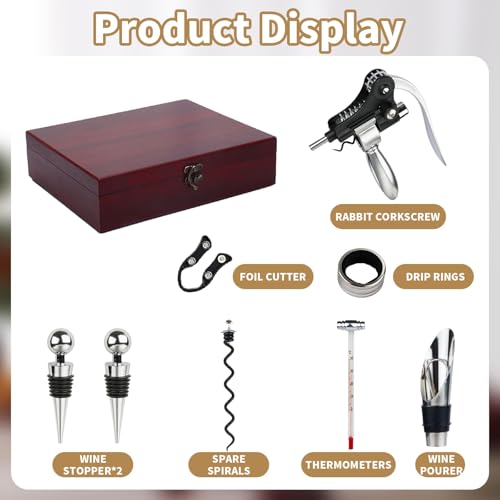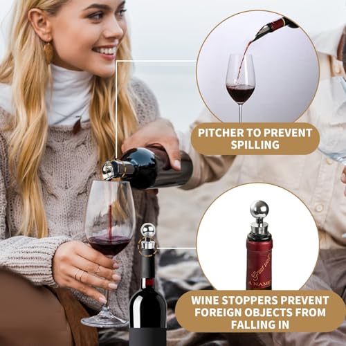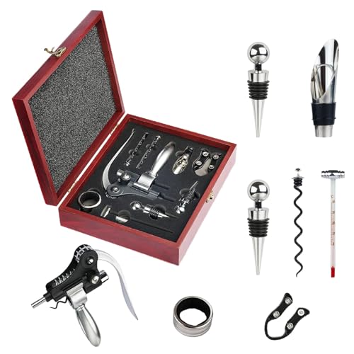 - 【Multifunctionality】: This wine opener set includes a variety of practical tools, such as pouring device, drip proof ring, vacuum wine stopper, wine stopper, thermometer, and spare spiral drill, to meet various needs such as bottle opening, pouring, storage, and temperature measurement.