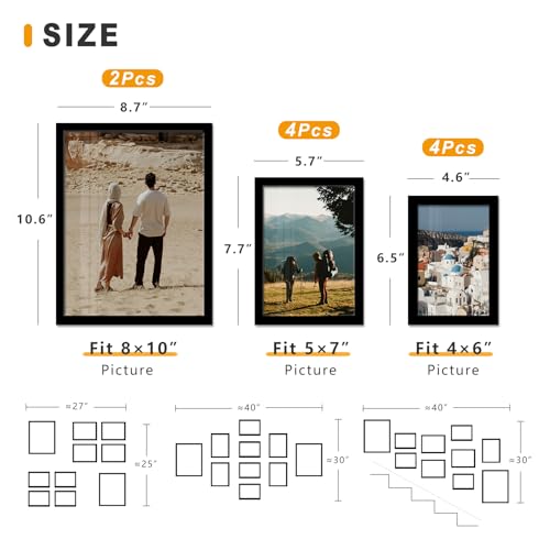 - Mix & Match Sizes: 10 Pack picture frames set includes 4×6 (4pcs), 5×7 (4pcs), and 8×10 (2pcs), frames for wall and tabletop