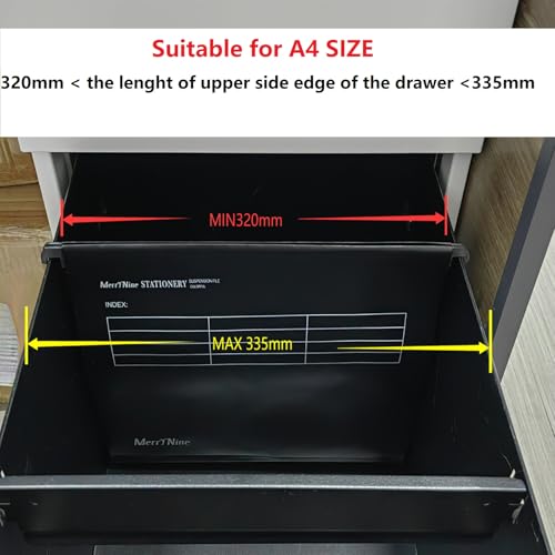 - ✅*VERY important * Please measure the required size before purchasing. Only applicable to A4 files or A4 cabinets. Our distance from the center of the rail to the center of the rail is 330mm. Please measure the width between your two rails – "Filing Pitch": This is the width between the two rails in the cabinet, and the bar will be located on Filing Pitch, preferably 330mm. There is also a certain range of swing that can be applied to rail to rail dimensions ranging from 320mm to 335mm