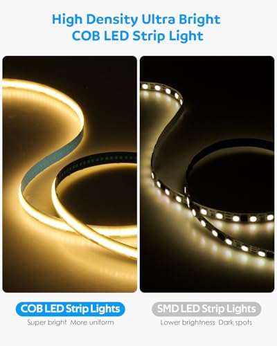 - Flexible and Widly Use: With a strong self-adhesive tape on the back of the cob brighter flexible tape lights, you can easily install it in narrow places, like under cabinets, sofa, wardrobe, TV backlight, furniture lighting. Please keep the surface clean before installation so that the bonding performance will be better. In addition, The flexible FPCB led strip allows it to bend freely at any angle(e.g. ±90°).