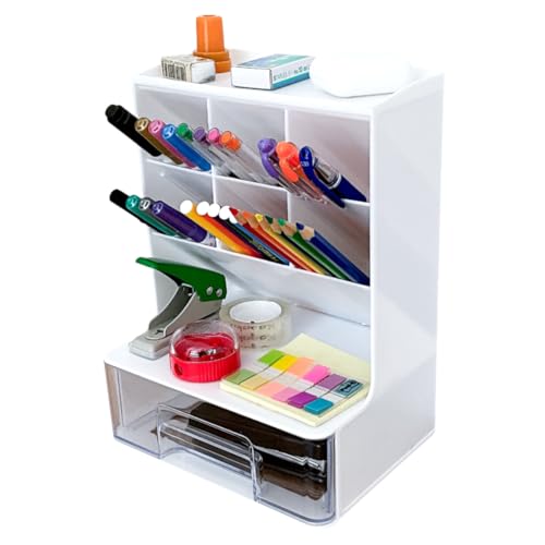 - White Desk Organiser with Clear Drawer – Calm and simple white plastic desk tidy with clear drawer keeps pens, stationery, and supplies neat, visible, and easy to reach for home or office.