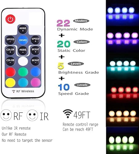 - 【Multi-function】LED RGB under cabinet lights has more functions when you use it in the life, such as 22 dynamic modes, 20 static colors, 5 brigtness grades and 10 speed grades.