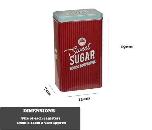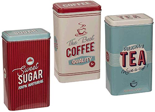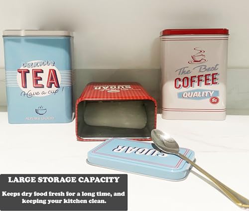- 3 VINTAGE CANISTERS: Stylish tin canister decorations designed for Sugar, Coffee and Tea storage. Eye-catching kitchen decorations that will look beautiful displayed on a kitchen shelf, bar or counter.. We are big fans of with this attractive set that provides a practical storage solution.