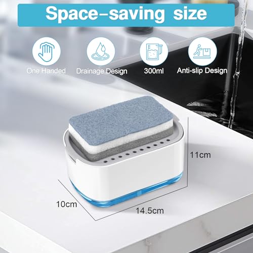 - One-Handed Operation: With the pump design, just use one hand to press the 2-in-1 soap dispenser and evenly distribute the soap onto the sponge.