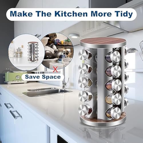 - 360° Rotating Spice Rack – Saves Space & Effort This space-saving spice organizer (H34×D19.3cm) features a smooth 360° rotating base, allowing one-handed access to all 20 spice jars (H9.5×D4.5cm, 80ml each). The jars are perfectly spaced to prevent tipping, ideal for tight countertops, cabinets, or pantry corners.