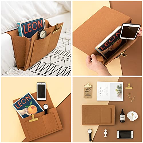 - The size of the bedside holder is 12.5L* 7.8H * 3.9W inches which also fits for iPad.And the weight is only 0.27lb. The bedside caddy,remote holder for bed is made of felt with reinforced stitching, make it strong and durable to be your great bedside buddy