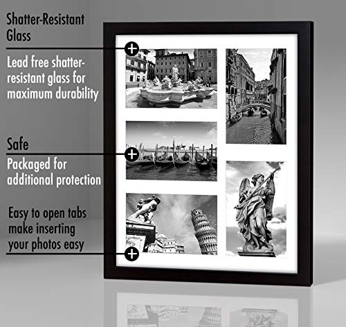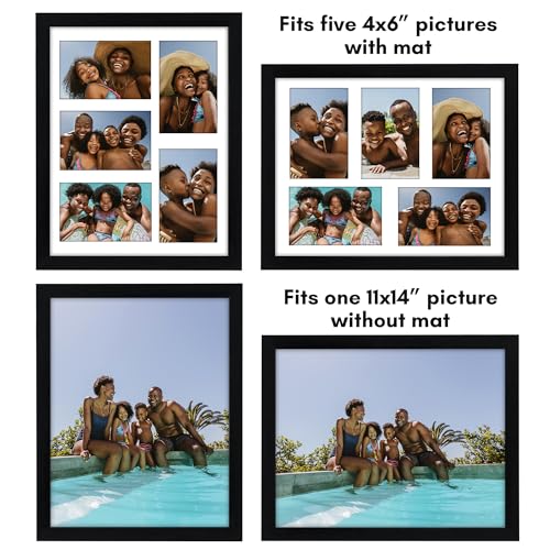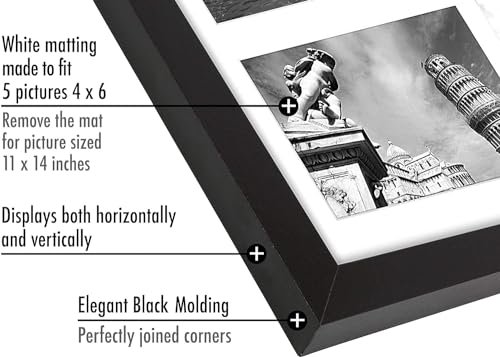 - Design: Black 11×14 frame with five 6×4 inch (10×15 cm) openings. Includes a white bevelled mount and hanging hardware for easy display in horizontal or vertical format.