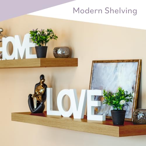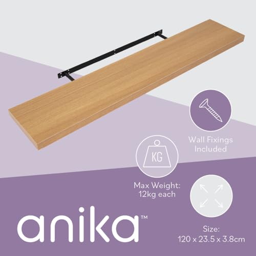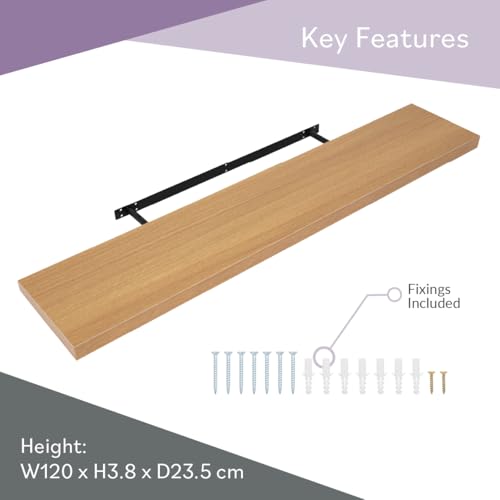 - OAK EFFECT FINISH – Each shelf is manufactured from 3.8cm thick hollowboard, and is finished with an oak effect. The shelf is 120cm x 23cm (L x W).