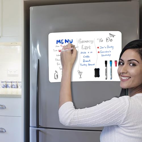 - Multi-purpose Whiteboard Sheet – This completely blank dry erase board has plenty of space to write important notes that need to be remembered. You can use it as a grocery list to keep track of fridge inventory, use it as a magnetic to do list for fridges to remind you to get things done, use it as a message board to leave notes for family