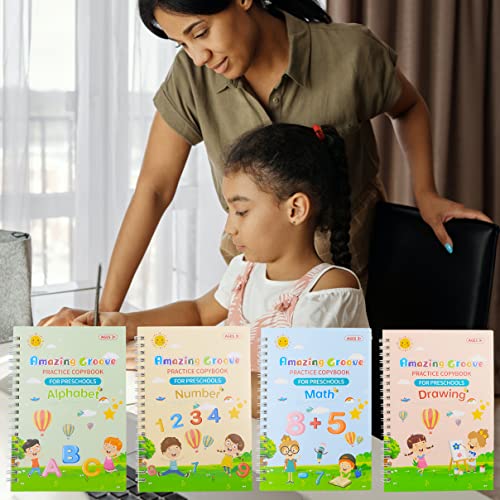 - 【4 In 1 Copybook Set】4 pieces magic practice copybook (Math, Alphabet, Numbers, and Drawing) +1 pieces pen holder + 10 pieces magic pen refills + 1 pieces cute soft aid pen grip.