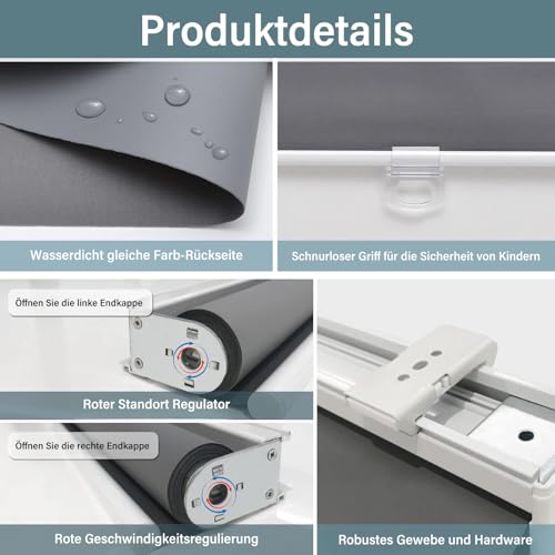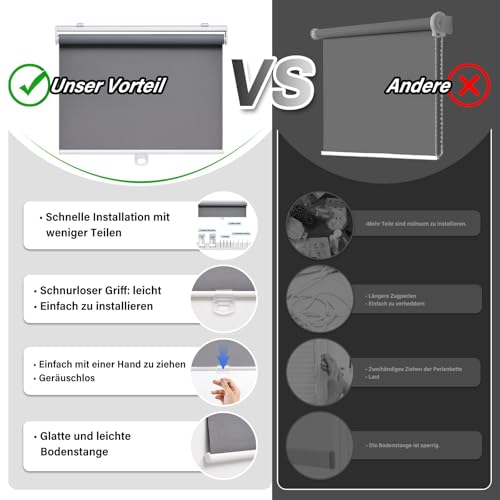 - Innovative design: the wireless design is safer for children and pets. Wireless roller blinds are more practical than models with cords. Thanks to the robust spring mechanism (5,000 test cycles per blind), the blind can be gently stopped at any desired position. Simply pull down to open, lightly press the clasp to close – the blind closes automatically.