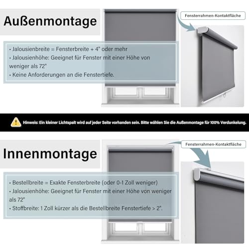 - Size selection: For outdoor mounting: blind width must be 10 cm wider than the window (e.g. order 70 cm for window width 60 cm). For interior mounting: choose the same or slightly smaller width as the window. The height can be adjusted from 0 to 180 cm. Note: The fabric width is 2 cm narrower than the specified blind size.