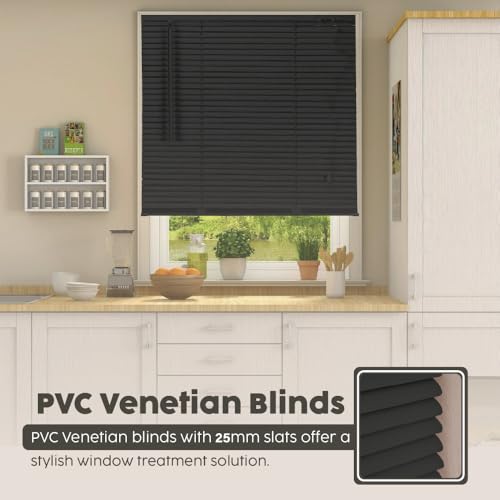 - PVC Venetian Blinds 25mm thin slats in various width x drops format using the Centimeter as measuring unit. White, Black and Grey have plain smooth slats while Teak, Natural and Walnut colors have wood effect design printed on them.