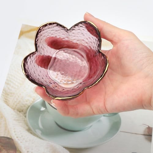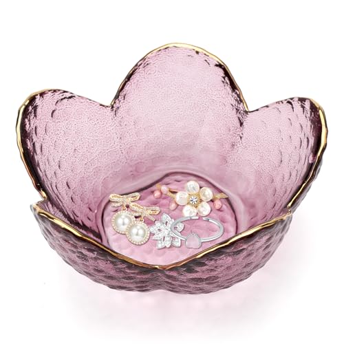 - [Elegant Flower Design]: Beautiful flower-shaped glass trinket dish, which features a luxurious gold rim that enhances its sophistication and complements modern and vintage decor styles