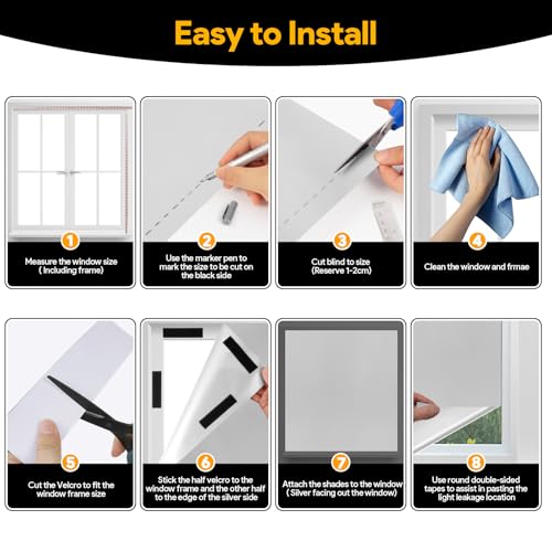 - Cut to Size: The temporary blackout blind measures 200x148cm, extra large size means you can cut to the fitting size and shape to suit your needs, attached a roll of tape measure and marker pen to help you with this step. It is recommended to leave 2-3cm in advance when cutting to perfectly cover the edges of the window and block the sunlight. Portable blackout blind is perfect for all shapes of windows (square, arched, round, roof conservatories, skylights).