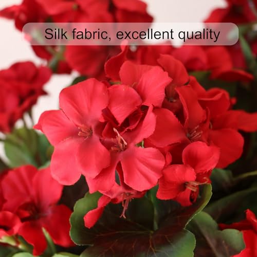 - 【Artificial Silk Flowers for Home Decoration】: the vivid red petals and lush green leaves add a touch of natural charm to your home decoration. These artificial geraniums bring wonderful decor effect for outdoor, indoor, window box, hanging basket, pots, flower bed, garden, patio, balcony.