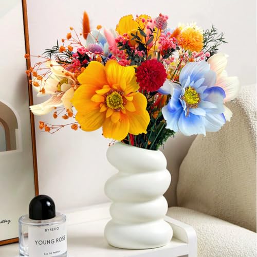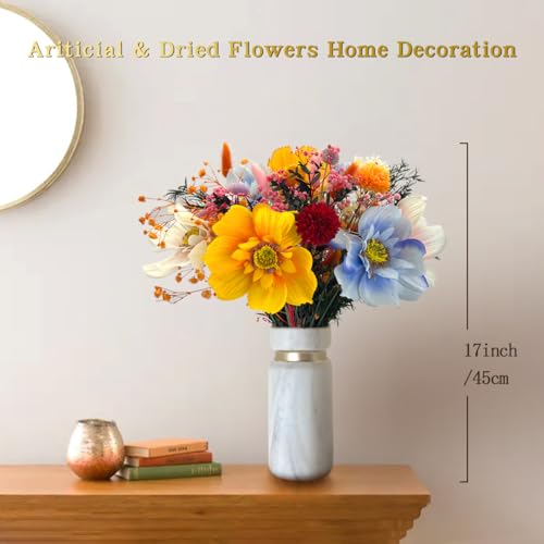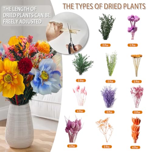 - Rich Content: You will r colorful flower and dried flowers are approximately 15.7 inches ineceive 11 pieces of artificial flowers and 28 pieces of dried flowers, including 6 bright colors: purple, orange, white, yellow, pink, and red. Artificial flowers and dried flowers create a natural and gorgeous appearance, a rich combination for satisfying your home decoration needs. You can combine them freely.