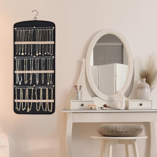 - Premium gift: This hanging jewelry storage bag is easy to carry and organize. You can fold it and store it when you go out. 360° rotatable hook design, you can hang it in the wardrobe, bathroom, behind the door, on the wall, closet, etc. at home without taking up space. It is an ideal gift for women, wives, girlfriends, mothers, etc