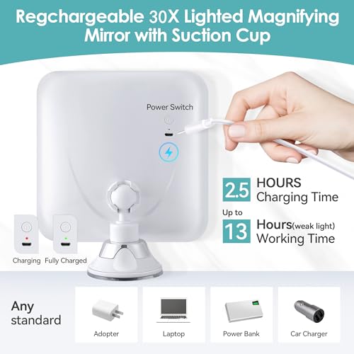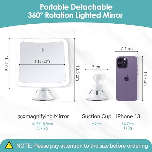 - 【30x Magnifiying Mirror with Light】This upgraded 30X Magnifying Makeup Mirror with Lights allows you to get a closer look at specific areas of your face. Very useful for wearing contact lenses, eyebrow trimming and other eye details makeup.**Warm Tip**:Due to the very high magnification of 30x, please keep your eyes within 6cm from the mirror to get a clear and undistorted image!