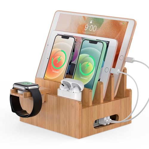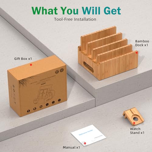 - Multi-device Organizer: Pezin & Hulin bamboo charging station stand can hold up to 8 devices (such as smartphone, smart watch, earbuds, game console, tablet, E-reader etc) simultaneous maintaining your devices in order and helps to clean up the stacking device charging