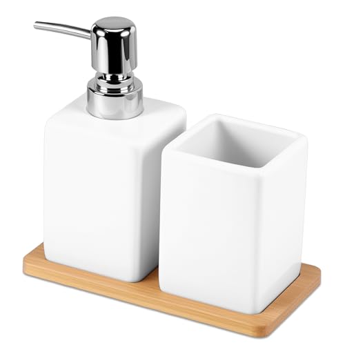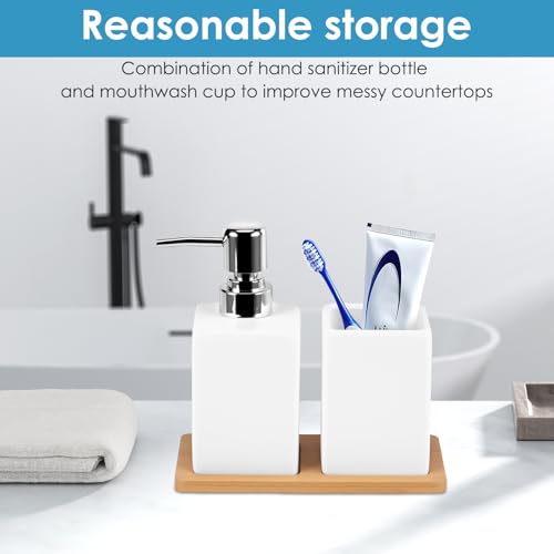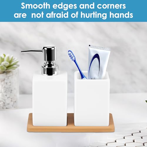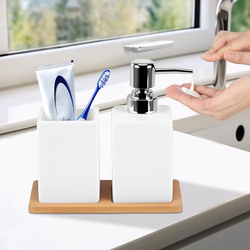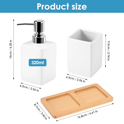 - 【3-in-1 Ceramic Bathroom Accessories Set】This set includes a soap dispenser, toothbrush holder and pedestal tray, which can provide all the basic accessories for your bathroom to help you keep it neat and organized. Each component is carefully designed to be both practical and beautiful, making it an ideal choice for enhancing your bathroom space.