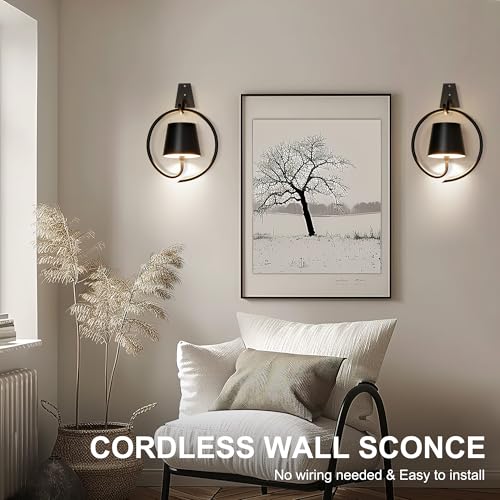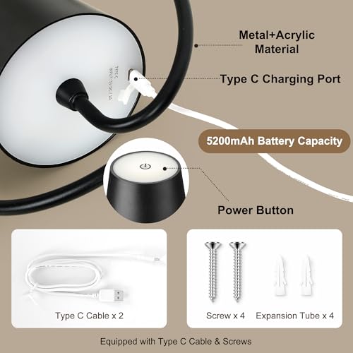 - [ Wireless Wall Lights ] The cordless wall sconce is built-in 5200mAh battery and equipped with a Type-C charging cable to charge the rechargeable light bulb. No wiring required for installation, battery operated wall lights can be easily installed on wall with screws and hook, freeing up your space design and bring more convenience to your life.