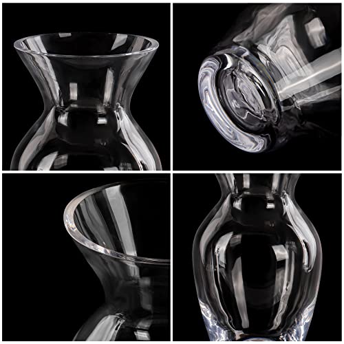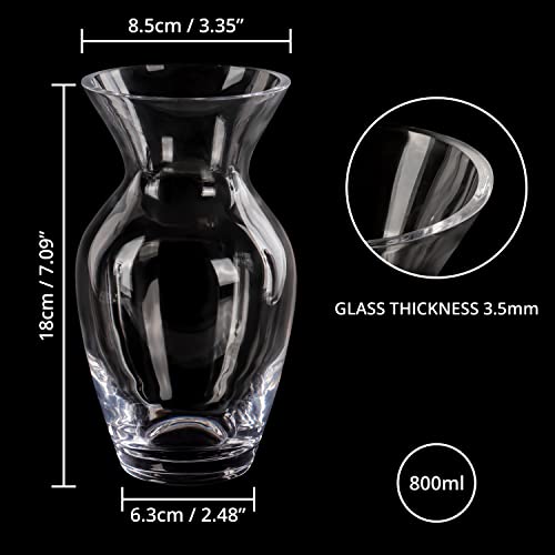 - CRYSTAL VASE: This decorative glass vase is perfect for brightening up your home. The vase is 18cm (7.09 inches) in height and has an opening diameter of 8.5cm (3.35 inches). The base of the vase is 6.3cm (2.48 inches) in diameter. The glass is 3.5mm thick and tapers in at the top and back out again. The transparent clear glass will sparkle and reflect light for a beautiful appearance. Our vases can hold 800ml of water.