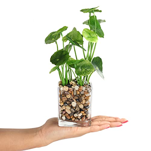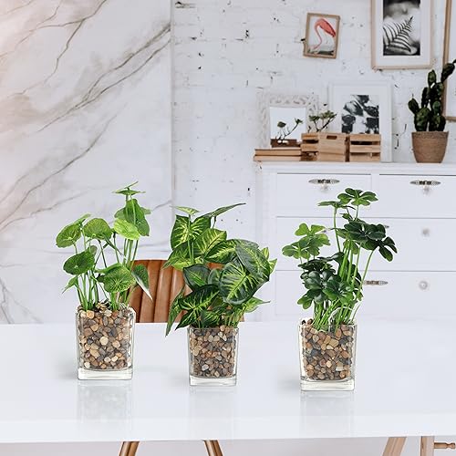 - 3 VIBRANT PLANTS: Included in our set are 3 faux plants which come in clear glass pots. Our natural-looking plants are made from high-quality plastic. The plants measure between 10-12cm (3.94-4.72 inches) in width and 22-23cm (8.66-9.06 inches) in height. The clear glass pots all measure W6.3 x H7.5cm (2.48 x 2.95 inches). For the full dimensions of all 3 plants, please refer to image 2 or the product description. The set includes a faux Taro, Clover and Lotus plant.