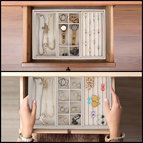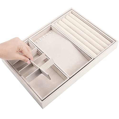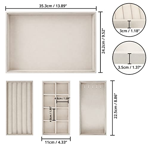 - JEWELLERY ORGANISER TRAYS: Included in our set are 4 jewellery trays. There is a 1 large base tray that measures L35.3 x W24.2 x H3.5cm (13.89 x 9.52 x 1.37 inches). The 3 small trays can be slotted into the base tray. These measure L22.5 x W11 x H3cm (8.85 x 4.33 x 1.18 inches). These trays have different inserts which can hold different types of jewellery. Each one is made from MDF which is covered in a soft cream, flocked velvet material. They are non-branded and do not come with lids.
