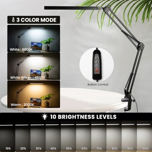 - 【3 COLOR MODES & 10 BRIGHTNESS LEVELS】: BIENSER bright desk lamp has 3 color temperatures optional: Warm light (3000K), Warm white light (4500K), and White light (6000K). Each lighting mode has 10 brightness dimming levels, 30 light modes in total. BIENSER LED desk lamp is ideal for every occasion: Office, Architect, Study, Drawing, knitting, Sewing, Handicrafts, Tasks, Workbench, etc