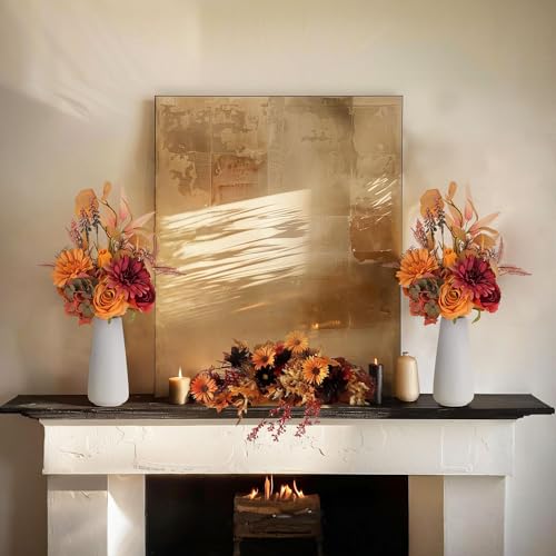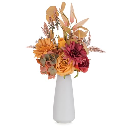 - Fall Vibe Bouquet with Vase: Our chic white ceramic vase and lifelike bouquet of roses, gerbera daisies, hydrangeas and greenery provide a autumn harvest vibe for autumn decorations. The warm orange and red hues of this autumn-inspired fake flowers bring a touch of seasonal beauty to any space.