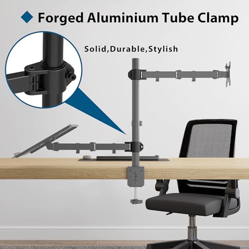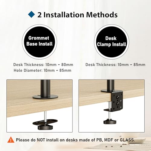 - ✅ FAST INSTALLATION WITH TWO MOUNTING OPTIONS – This monitor desk mount includes all necessary tools and hardware for a quick 10-minute setup. Choose between the heavy-duty C-clamp or the grommet base for secure attachment on different desk types, making installation fast, stable and hassle-free for any user
