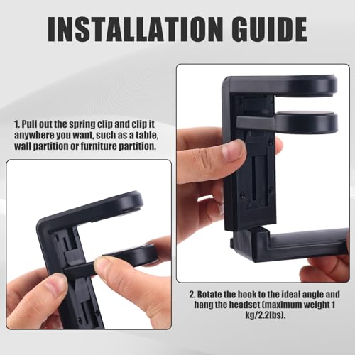 - Easy to Install: Firstly, pull out the spring clip and clip it anywhere you want, such as a table, wall partition or furniture partition. Then rotate the hook to the ideal angle and hang the headphones.