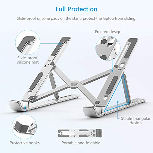 - 【Sturdy & Protective】This laptop stand is made of aluminum alloy that makes it scratch-resistant and sturdy. The slide-proof silicone pads on the stand keep the stand from sliding. The protective hooks ensure your computer does not slide off the stand.