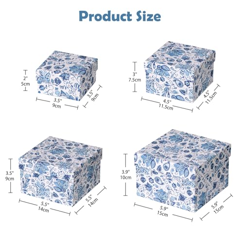 - Small Storage Boxes Dimensions: Pack with 4 different sizes of nested gift boxes, Small – 3.5*3.5*2 inches, Medium – 4.5 *4.5*3 inches, Large – 5.5*5.5*3.5 inches, The Biggest – 5.9*5.9*4 inches.