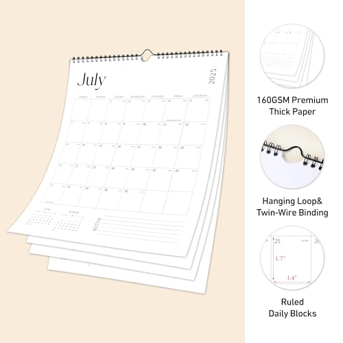 - Premium Quality – Our 2025 yearly paper wall calendar 18 month is made with extra-thick paper to prevent ink bleed-through, ensuring a smooth, worry-free writing experience. The sturdy twin-wire binding allows for easy page turning, so you can reference your schedule with ease