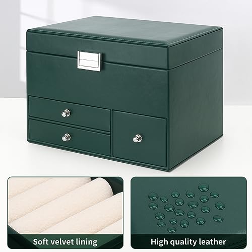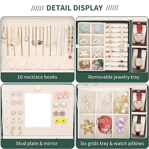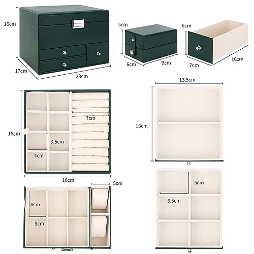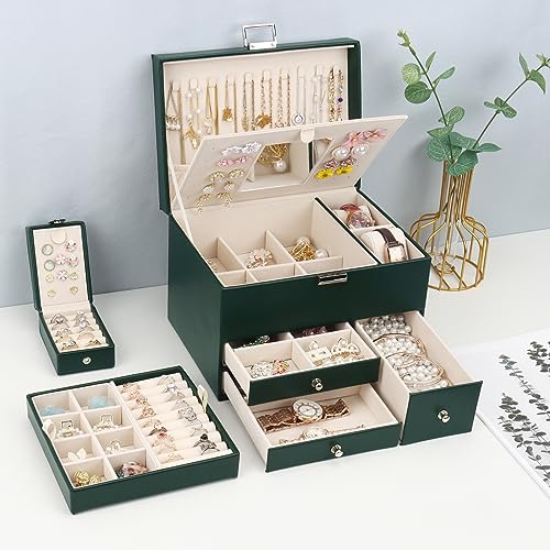 - ❤【Jewellery Box Organiser】: The 3-tier jewelry box can meet all jewelry display needs. Open the jewelry box, there is a large earring plate with 30 holes, and a mirror in the middle. There are 10 necklace hooks on the back of the stud plate. The PU jewelry box has a removable jewelry tray, two watch pillows and three small drawers.